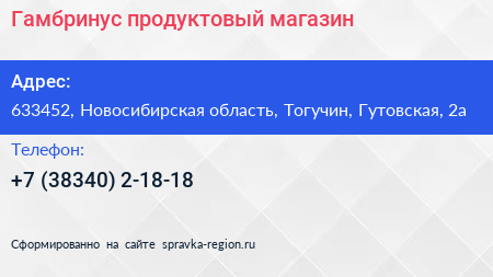 Гамбринус, продуктовый магазин по адресу 633452, Новосибирская область, Тогучин, Гутовская, 2а в дальнейшем Организация, размещена в следующих категориях: