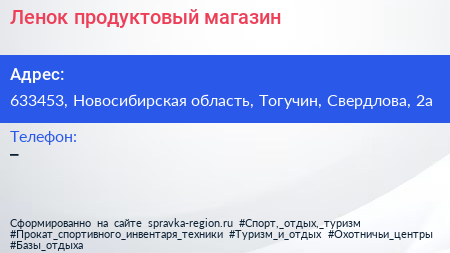 Ленок, продуктовый магазин по адресу 633453, Новосибирская область, Тогучин, Свердлова, 2а в дальнейшем Организация, размещена в следующих категориях: