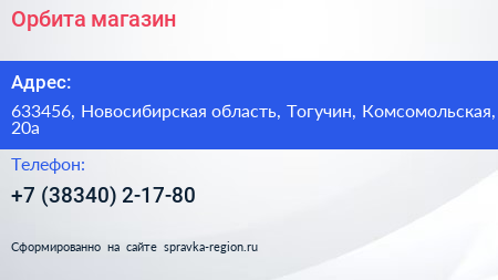 Орбита, магазин по адресу 633456, Новосибирская область, Тогучин, Комсомольская, 20а в дальнейшем Организация, размещена в следующих категориях: