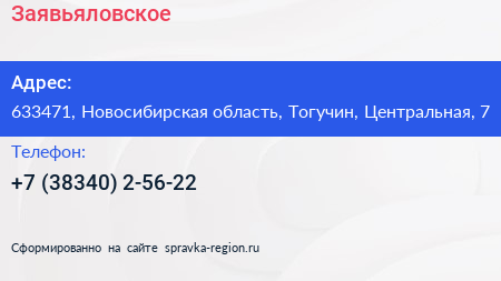 Заявьяловское по адресу 633471, Новосибирская область, Тогучин, Центральная, 7 в дальнейшем Организация, размещена в следующих категориях: