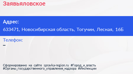 Заявьяловское по адресу 633471, Новосибирская область, Тогучин, Лесная, 16Б в дальнейшем Организация, размещена в следующих категориях: