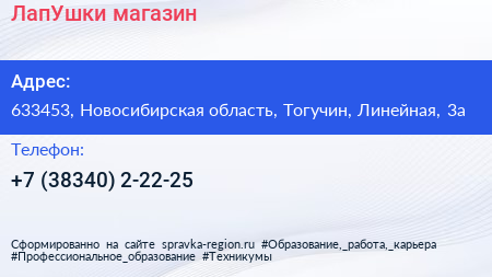 ЛапУшки, магазин по адресу 633453, Новосибирская область, Тогучин, Линейная, 3а в дальнейшем Организация, размещена в следующих категориях: