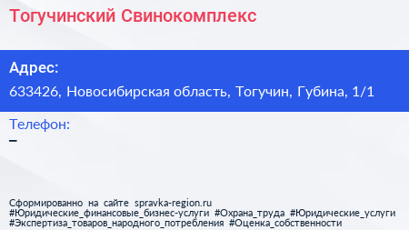 Тогучинский Свинокомплекс по адресу 633426, Новосибирская область, Тогучин, Губина, 1/1 в дальнейшем Организация, размещена в следующих категориях: