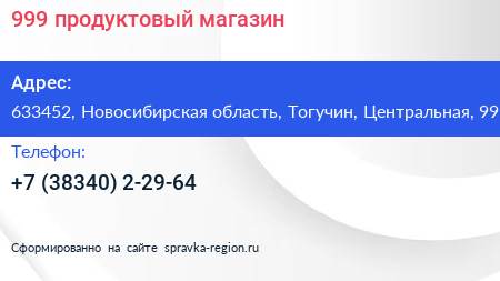 999, продуктовый магазин по адресу 633452, Новосибирская область, Тогучин, Центральная, 99 в дальнейшем Организация, размещена в следующих категориях:
