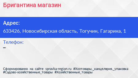 Бригантина, магазин по адресу 633426, Новосибирская область, Тогучин, Гагарина, 1 в дальнейшем Организация, размещена в следующих категориях: