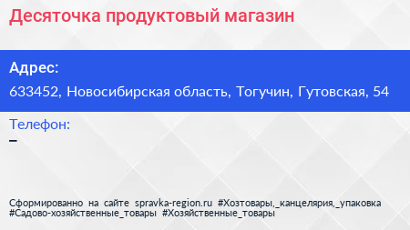 Десяточка, продуктовый магазин по адресу 633452, Новосибирская область, Тогучин, Гутовская, 54 в дальнейшем Организация, размещена в следующих категориях: