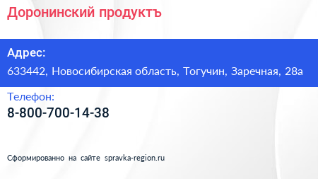 Доронинский продуктъ по адресу 633442, Новосибирская область, Тогучин, Заречная, 28а в дальнейшем Организация, размещена в следующих категориях:
