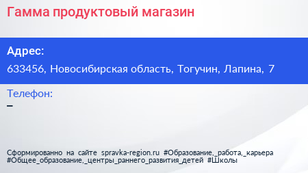Гамма, продуктовый магазин по адресу 633456, Новосибирская область, Тогучин, Лапина, 7 в дальнейшем Организация, размещена в следующих категориях: