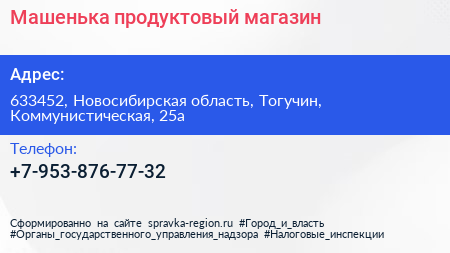 Машенька, продуктовый магазин по адресу 633452, Новосибирская область, Тогучин, Коммунистическая, 25а в дальнейшем Организация, размещена в следующих категориях: