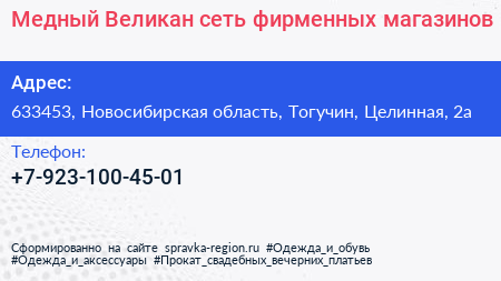 Медный Великан, сеть фирменных магазинов по адресу 633453, Новосибирская область, Тогучин, Целинная, 2а в дальнейшем Организация, размещена в следующих категориях: