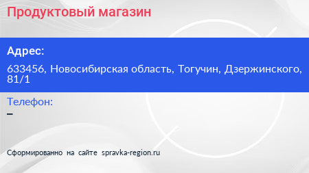 Продуктовый магазин по адресу 633456, Новосибирская область, Тогучин, Дзержинского, 81/1 в дальнейшем Организация, размещена в следующих категориях: