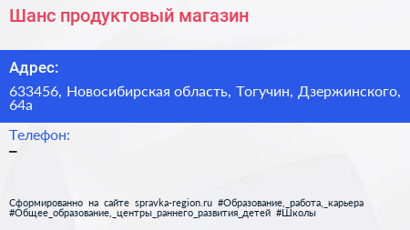 Шанс, продуктовый магазин по адресу 633456, Новосибирская область, Тогучин, Дзержинского, 64а в дальнейшем Организация, размещена в следующих категориях:
