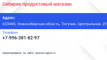 Сибиряк, продуктовый магазин по адресу 633440, Новосибирская область, Тогучин, Центральная, 25 в дальнейшем Организация, размещена в следующих категориях: