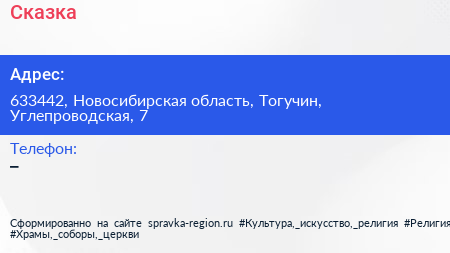 Сказка по адресу 633442, Новосибирская область, Тогучин, Углепроводская, 7 в дальнейшем Организация, размещена в следующих категориях: