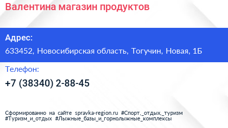 Валентина, магазин продуктов по адресу 633452, Новосибирская область, Тогучин, Новая, 1Б в дальнейшем Организация, размещена в следующих категориях: