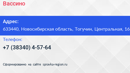 Вассино по адресу 633440, Новосибирская область, Тогучин, Центральная, 16 в дальнейшем Организация, размещена в следующих категориях: