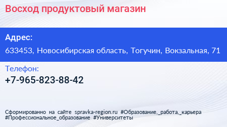 Восход, продуктовый магазин по адресу 633453, Новосибирская область, Тогучин, Вокзальная, 71 в дальнейшем Организация, размещена в следующих категориях: