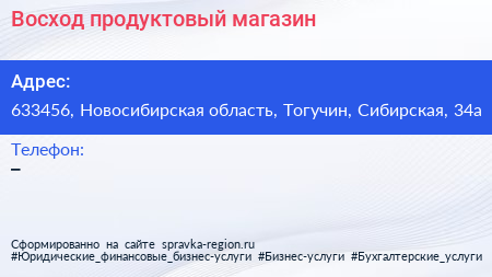 Восход, продуктовый магазин по адресу 633456, Новосибирская область, Тогучин, Сибирская, 34а в дальнейшем Организация, размещена в следующих категориях:
