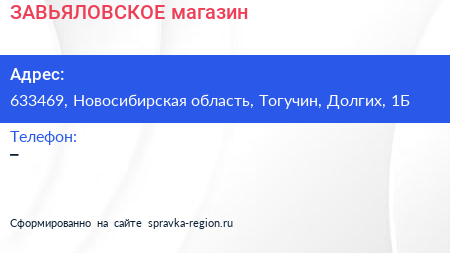 ЗАВЬЯЛОВСКОЕ, магазин по адресу 633469, Новосибирская область, Тогучин, Долгих, 1Б в дальнейшем Организация, размещена в следующих категориях: