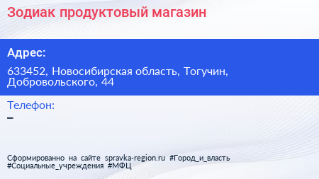 Зодиак, продуктовый магазин по адресу 633452, Новосибирская область, Тогучин, Добровольского, 44 в дальнейшем Организация, размещена в следующих категориях: