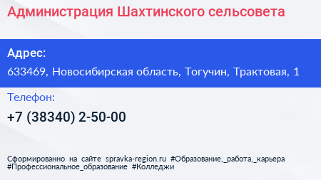 Администрация Шахтинского сельсовета по адресу 633469, Новосибирская область, Тогучин, Трактовая, 1 в дальнейшем Организация, размещена в следующих категориях: