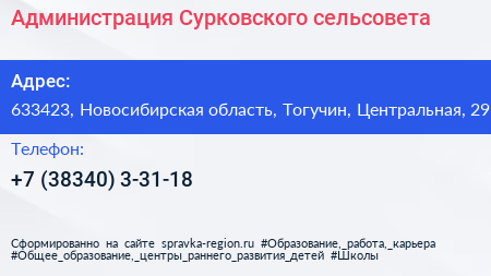 Администрация Сурковского сельсовета по адресу 633423, Новосибирская область, Тогучин, Центральная, 29 в дальнейшем Организация, размещена в следующих категориях: