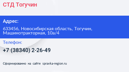 СТД Тогучин по адресу 633456, Новосибирская область, Тогучин, Машинотракторная, 10а/4 в дальнейшем Организация, размещена в следующих категориях: