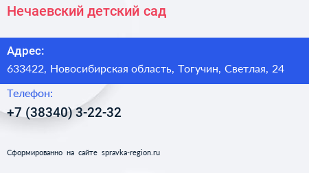Нечаевский детский сад по адресу 633422, Новосибирская область, Тогучин, Светлая, 24 в дальнейшем Организация, размещена в следующих категориях: