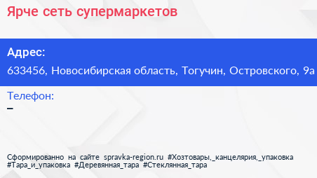 Ярче!, сеть супермаркетов по адресу 633456, Новосибирская область, Тогучин, Островского, 9а в дальнейшем Организация, размещена в следующих категориях: