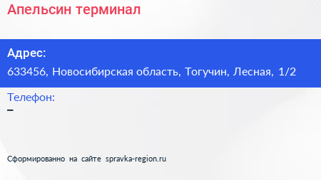 Апельсин, терминал по адресу 633456, Новосибирская область, Тогучин, Лесная, 1/2 в дальнейшем Организация, размещена в следующих категориях: