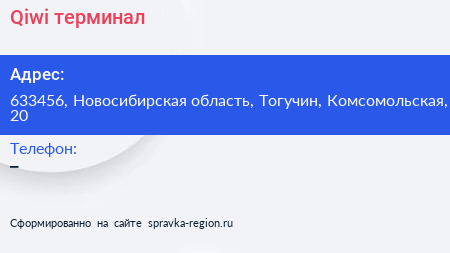 Qiwi, терминал по адресу 633456, Новосибирская область, Тогучин, Комсомольская, 20 в дальнейшем Организация, размещена в следующих категориях: