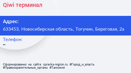 Qiwi, терминал по адресу 633453, Новосибирская область, Тогучин, Береговая, 2а в дальнейшем Организация, размещена в следующих категориях: