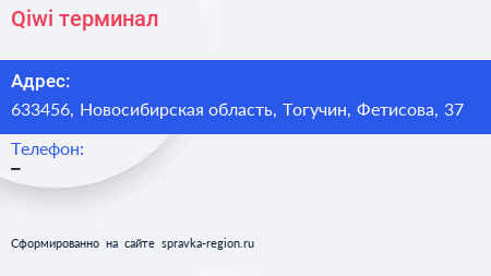 Qiwi, терминал по адресу 633456, Новосибирская область, Тогучин, Фетисова, 37 в дальнейшем Организация, размещена в следующих категориях: