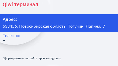 Qiwi, терминал по адресу 633456, Новосибирская область, Тогучин, Лапина, 7 в дальнейшем Организация, размещена в следующих категориях: