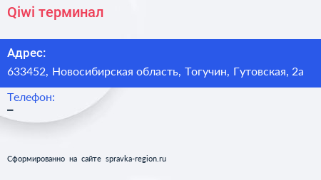 Qiwi, терминал по адресу 633452, Новосибирская область, Тогучин, Гутовская, 2а в дальнейшем Организация, размещена в следующих категориях: