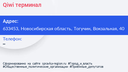 Qiwi, терминал по адресу 633453, Новосибирская область, Тогучин, Вокзальная, 40 в дальнейшем Организация, размещена в следующих категориях: