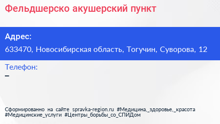 Фельдшерско-акушерский пункт по адресу 633470, Новосибирская область, Тогучин, Суворова, 12 в дальнейшем Организация, размещена в следующих категориях: