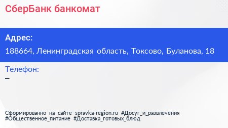 СберБанк, банкомат по адресу 188664, Ленинградская область, Токсово, Буланова, 18 в дальнейшем Организация, размещена в следующих категориях: