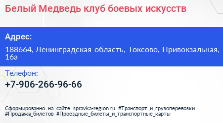 Белый Медведь, клуб боевых искусств по адресу 188664, Ленинградская область, Токсово, Привокзальная, 16а в дальнейшем Организация, размещена в следующих категориях: