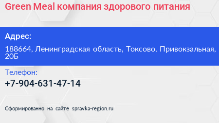 Green Meal, компания здорового питания по адресу 188664, Ленинградская область, Токсово, Привокзальная, 20Б в дальнейшем Организация, размещена в следующих категориях: