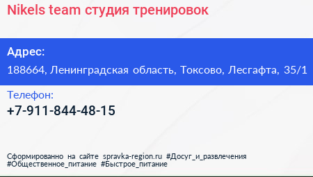 Nikels team, студия тренировок по адресу 188664, Ленинградская область, Токсово, Лесгафта, 35/1 в дальнейшем Организация, размещена в следующих категориях: