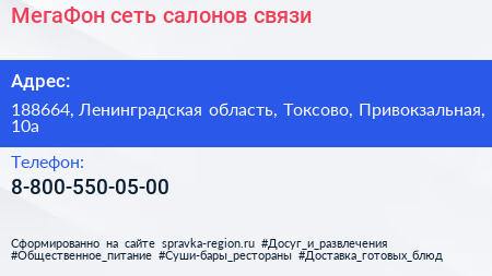 МегаФон, сеть салонов связи по адресу 188664, Ленинградская область, Токсово, Привокзальная, 10а в дальнейшем Организация, размещена в следующих категориях:
