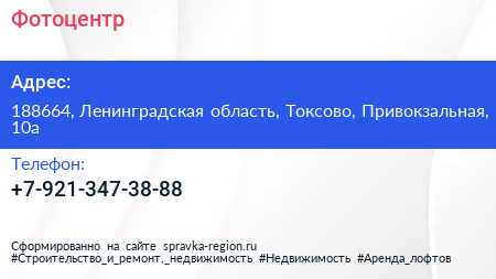 Фотоцентр по адресу 188664, Ленинградская область, Токсово, Привокзальная, 10а в дальнейшем Организация, размещена в следующих категориях: