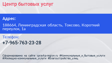 Центр бытовых услуг по адресу 188664, Ленинградская область, Токсово, Короткий переулок, 1а в дальнейшем Организация, размещена в следующих категориях: