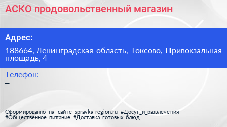 АСКО, продовольственный магазин по адресу 188664, Ленинградская область, Токсово, Привокзальная площадь, 4 в дальнейшем Организация, размещена в следующих категориях: