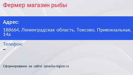 Фермер, магазин рыбы по адресу 188664, Ленинградская область, Токсово, Привокзальная, 14а в дальнейшем Организация, размещена в следующих категориях: