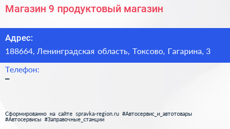 Магазин №9, продуктовый магазин по адресу 188664, Ленинградская область, Токсово, Гагарина, 3 в дальнейшем Организация, размещена в следующих категориях: