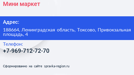 Мини-маркет по адресу 188664, Ленинградская область, Токсово, Привокзальная площадь, 4 в дальнейшем Организация, размещена в следующих категориях: