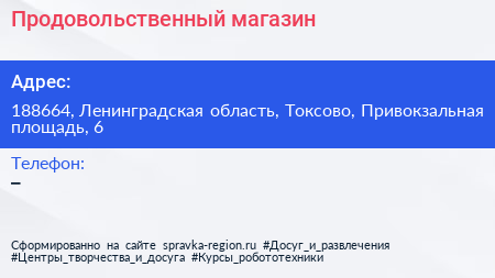 Продовольственный магазин по адресу 188664, Ленинградская область, Токсово, Привокзальная площадь, 6 в дальнейшем Организация, размещена в следующих категориях: