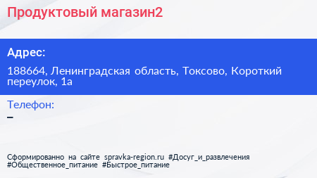 Продуктовый магазин2 по адресу 188664, Ленинградская область, Токсово, Короткий переулок, 1а в дальнейшем Организация, размещена в следующих категориях: